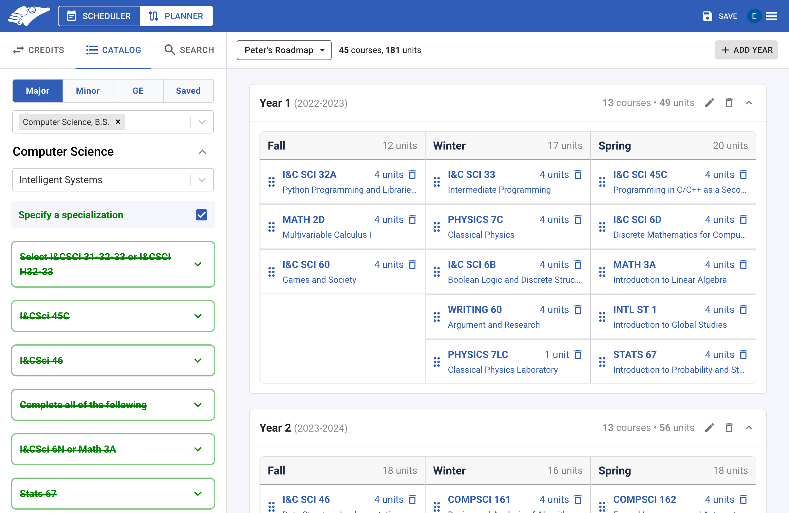 With two great apps and a thriving organization, we realized we could create a result that defines the next decade of course planning at UCI. AntAlmanac (Scheduler) has amassed a consistent, loyal user base <3, and PeterPortal (Planner) has much-needed features to cover aspects of course planning that live beyond just the current term.